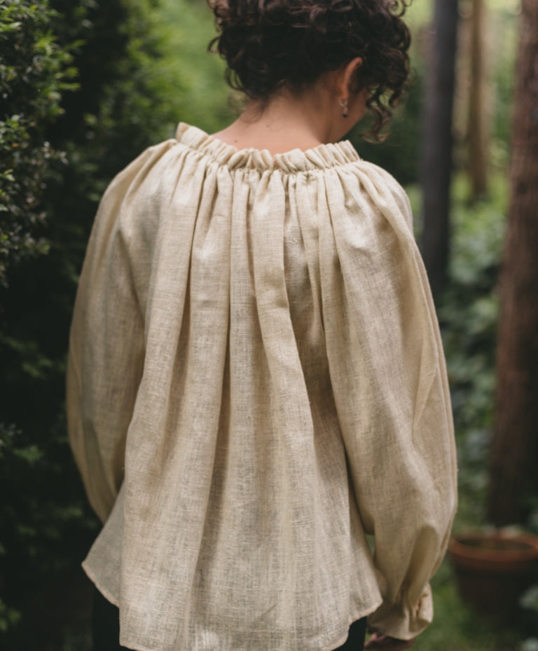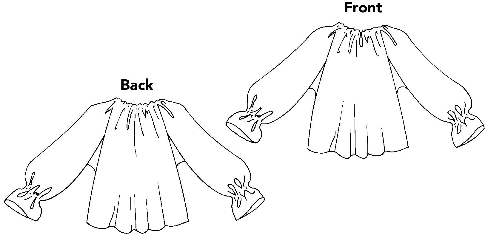 Our Romanian Blouse has a gathered neckline, underarm gussets, and sleeves that can be worn three-quarter or full length, with options for a self-formed deep ruffled cuff, a cuff that gathers at the wrist, or hanging loose sleeve. Our "one size" pattern will fit busts up to 40" (102cm).