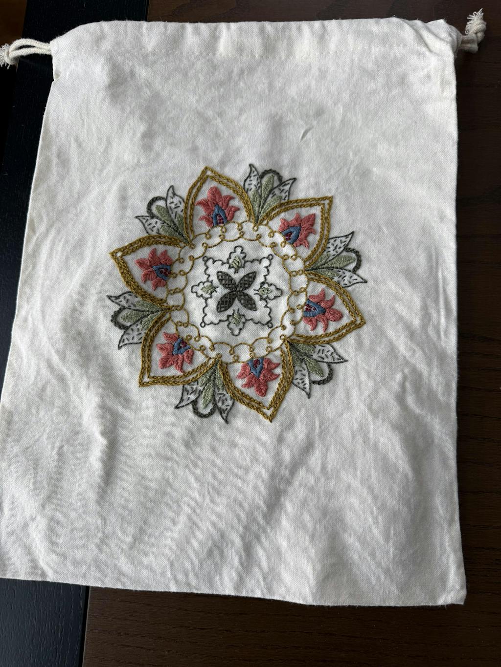Each workbag comes with: one 12x15" muslin bag printed with design, one 6" beechwood hoop, 8 floss organizers, one needleminder, one John James size 7 sharp embroidery needle, DMC floss, stitch diagram, and my Basics of Hand Embroidery instruction booklet.