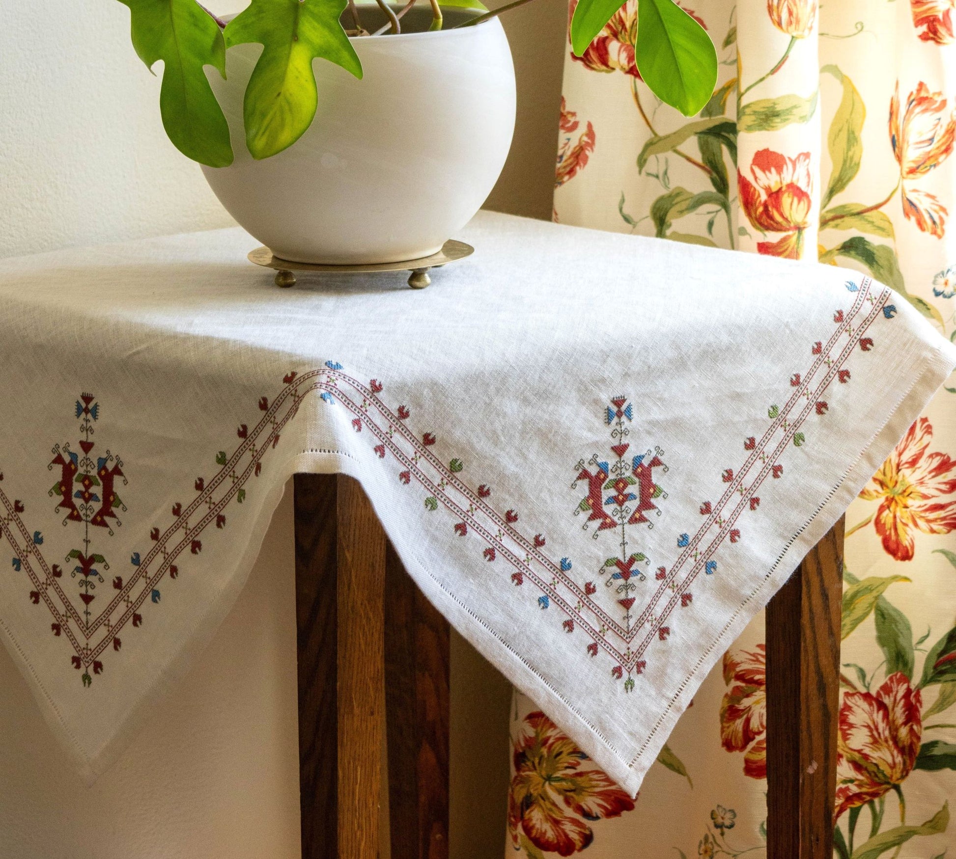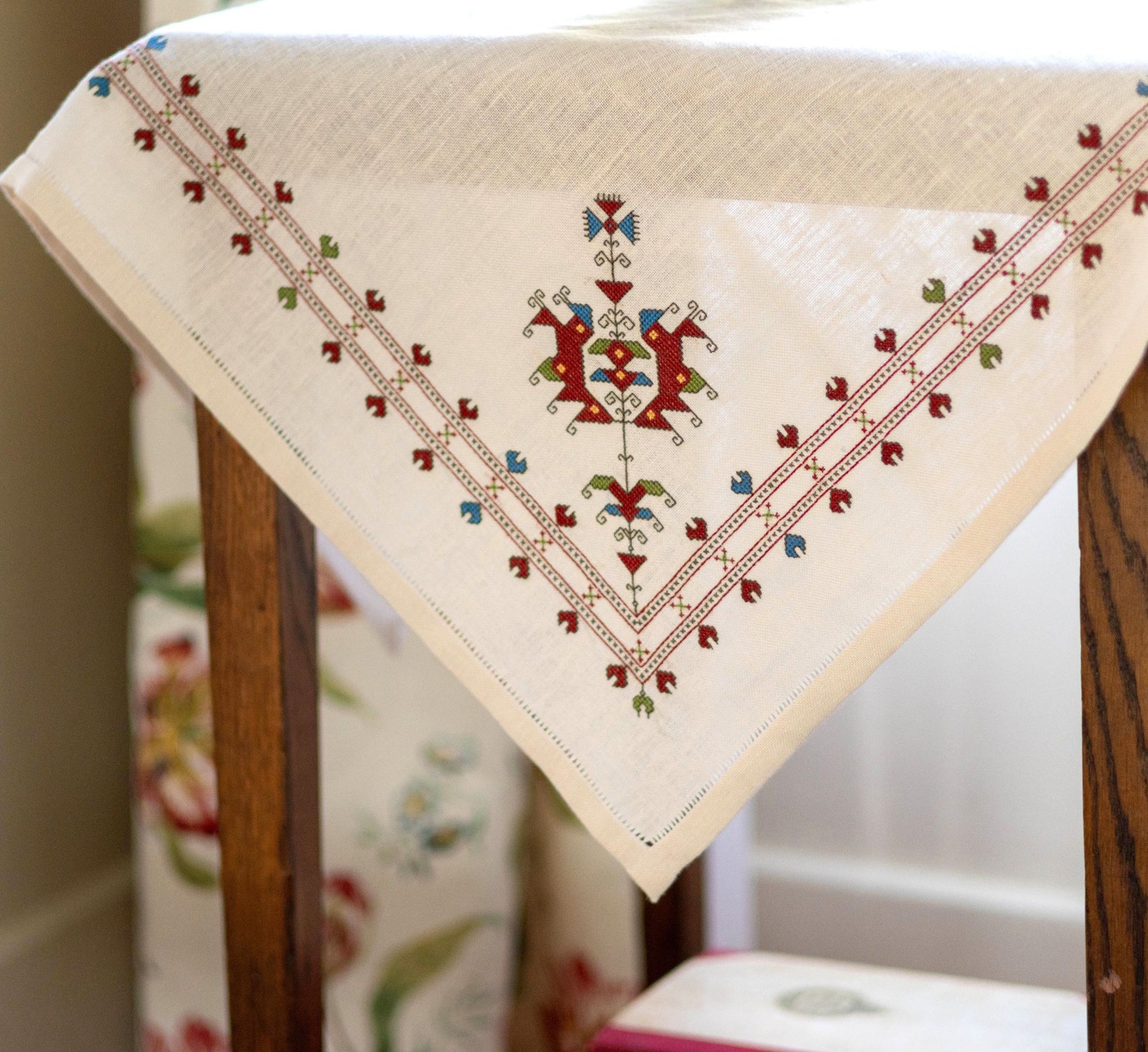 The Thracian Rose folk embroidery kit is a graceful example of traditional folk embroidery, this design originates in a vintage embroidery from Greece. Large, stylized roses are set within the corners of a simple repeating floral border for an intricate yet delicate effect. Worked in the same color palette of terra cotta, grey-brown, blue, yellow, and green as the original and finished as a table square, this striking embroidery brings historic beauty to any home. Kit includes: 32ct 100% European linen in Parchment*, DMC 100% cotton embroidery floss, John James size 24 needle, full color charts and instructions (a PDF copy of the pattern will also be sent to you).